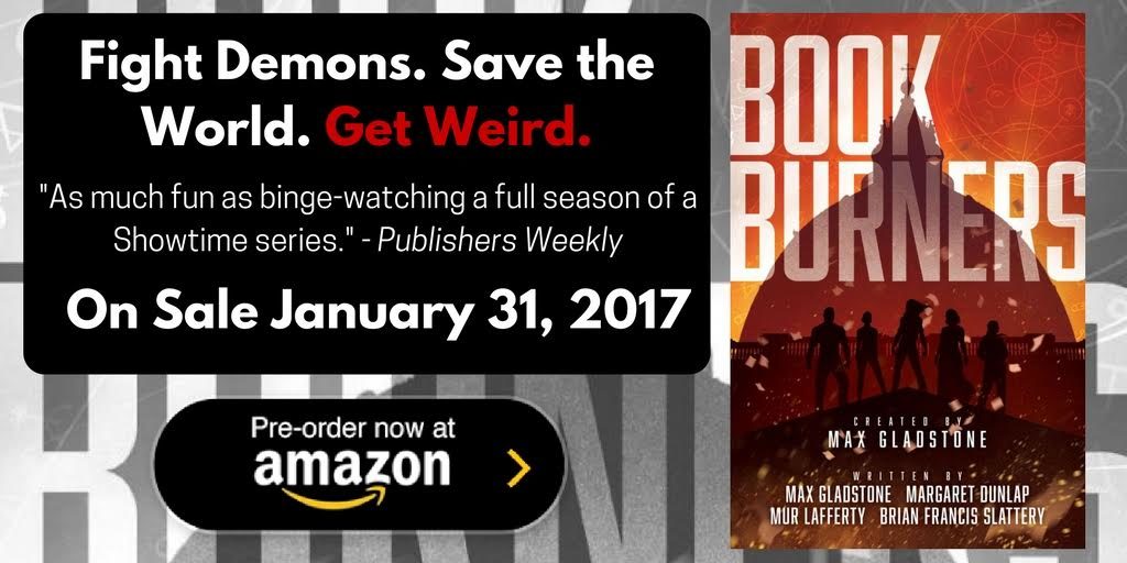 Then from Saga and Serial Box comes my collaboration (with Max Gladstone, Brian Francis Slattery, and Margaret Dunlap) Bookburners. It’s a horror/urban fantasy story about a Vatican team who chase down magical books and contain them before terrible things happen. (Usually right when terrible things are happening, otherwise the story wouldn’t be interesting.) Naomi Novik says “Bookburners is sheer enormous fun!” It’s also appeared on several “January books to look for” lists!