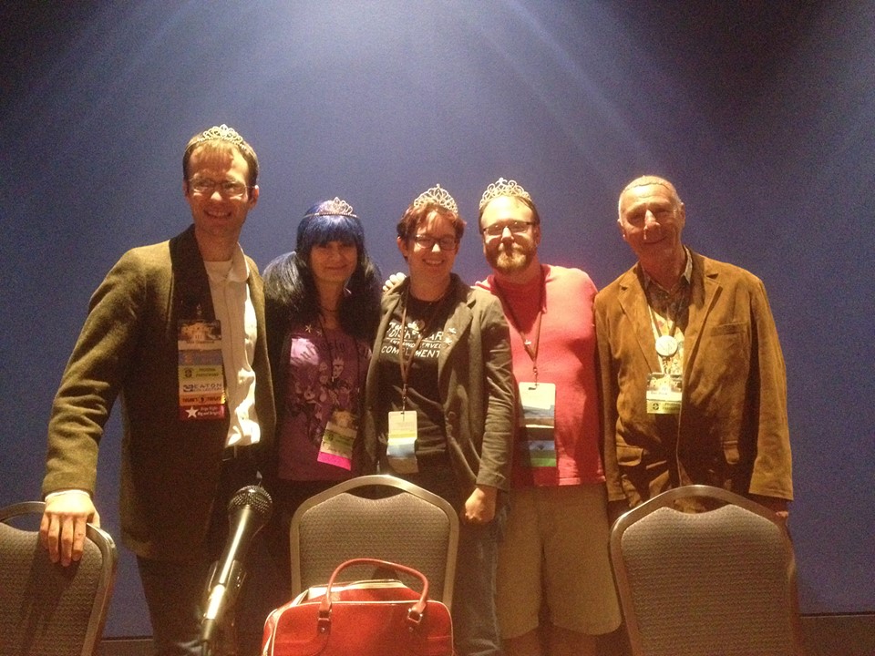 The other nominees are awesome people. The next day, Max, Steph, and I went shopping for tiaras to form Team Tiara for real, and we found some nice ones at the mall. We brought them to the Campbell panel, which included Ben Bova, the creator of the Campbell Award. Ben wore his tiara with good humor. (We got him an understated one, you can barely see it in the weird lighting below.)